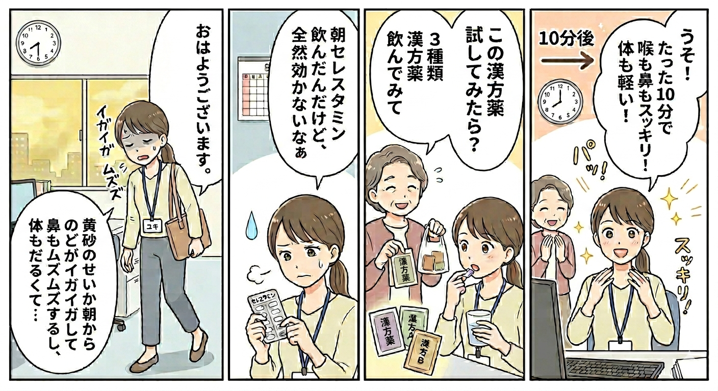 ステロイドも効かない?黄砂にも漢方? Posted 2026年4月22日 by umechan 黄砂がだいぶひどいようで、鼻水、鼻づまり、喉の違和感を訴える相談がありました。朝にセレスタミンというステロイドが入った薬を飲んだが全然効かないということでした。基本的に花粉症と同じ治し方ですが、炎症をとったり、鼻水、鼻詰まりを改善する漢方薬を3種類飲んでもらったところ10分後には、喉の違和感も消え、鼻詰まりも楽になられました。漢方薬は、体に合うものを選べば即効性が高いです。
